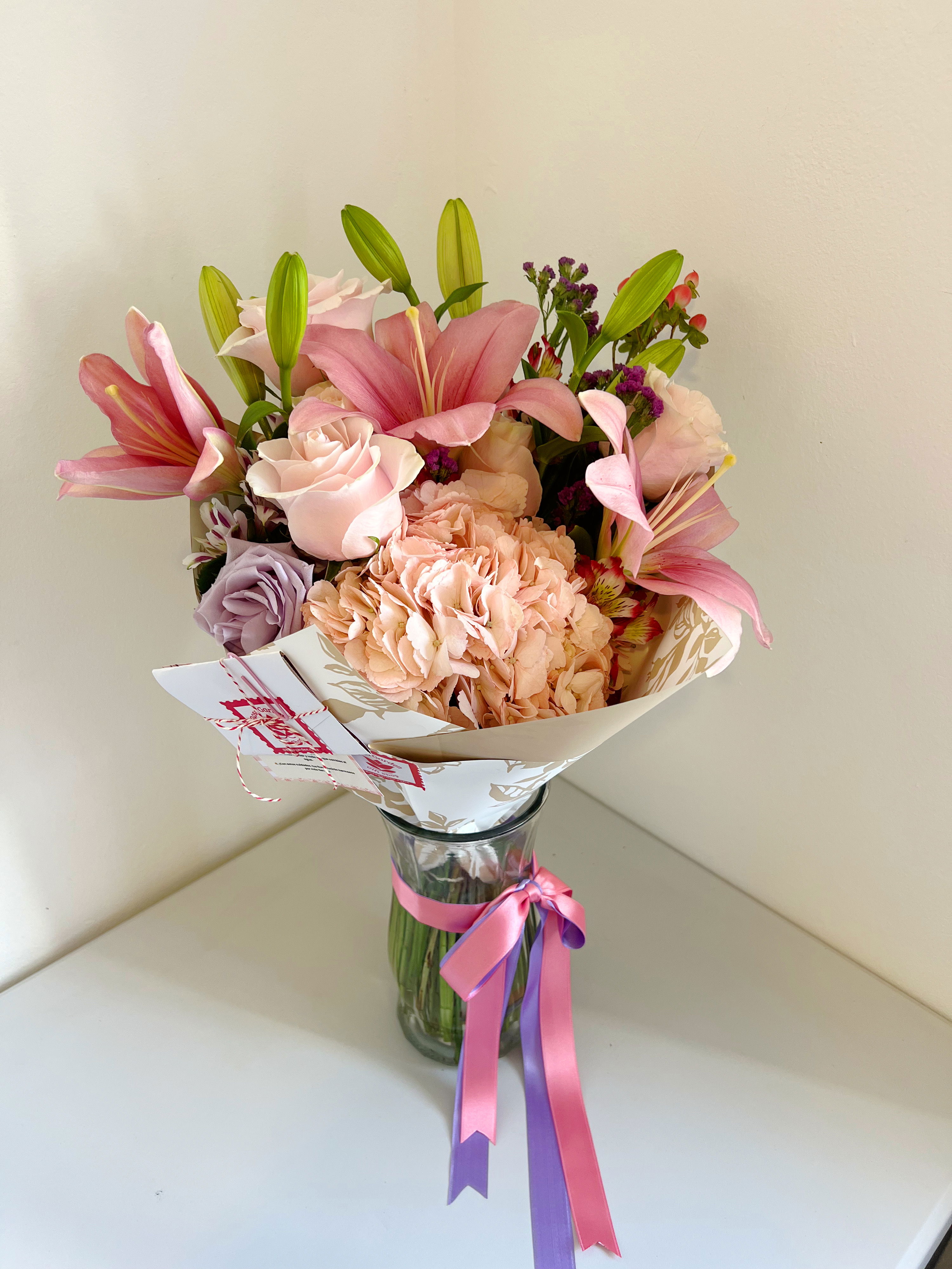 Este Ramo está compuesto por flores variadas de estación. El tipo de flor puede variar según el día y temporada. Se mantiene el estilo pero ningún ramo es igual a otro, cada uno es único.