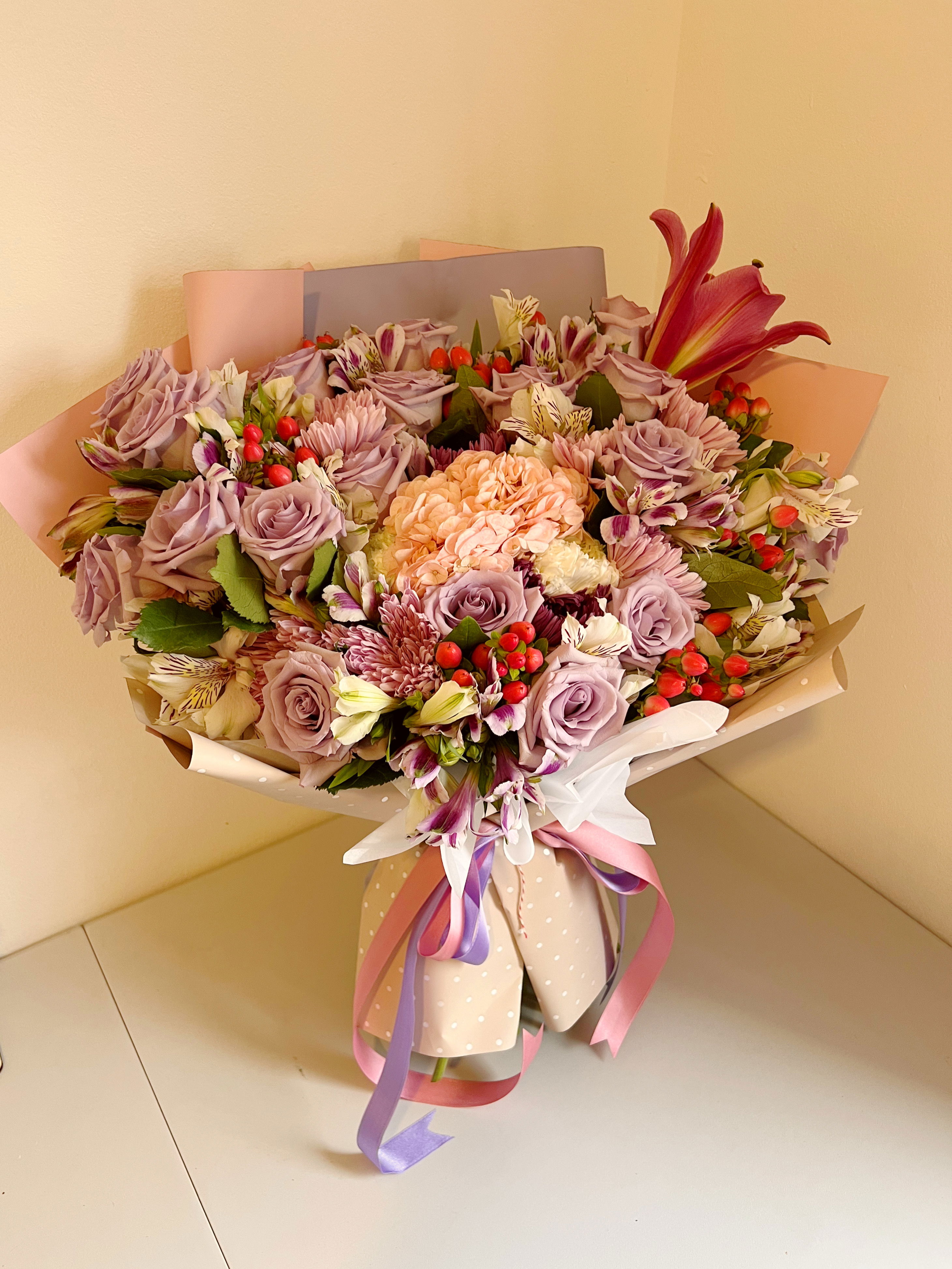 💜Flores complementarias en tonos pastel (puede variar entre claveles, margaritas, conejitos...)