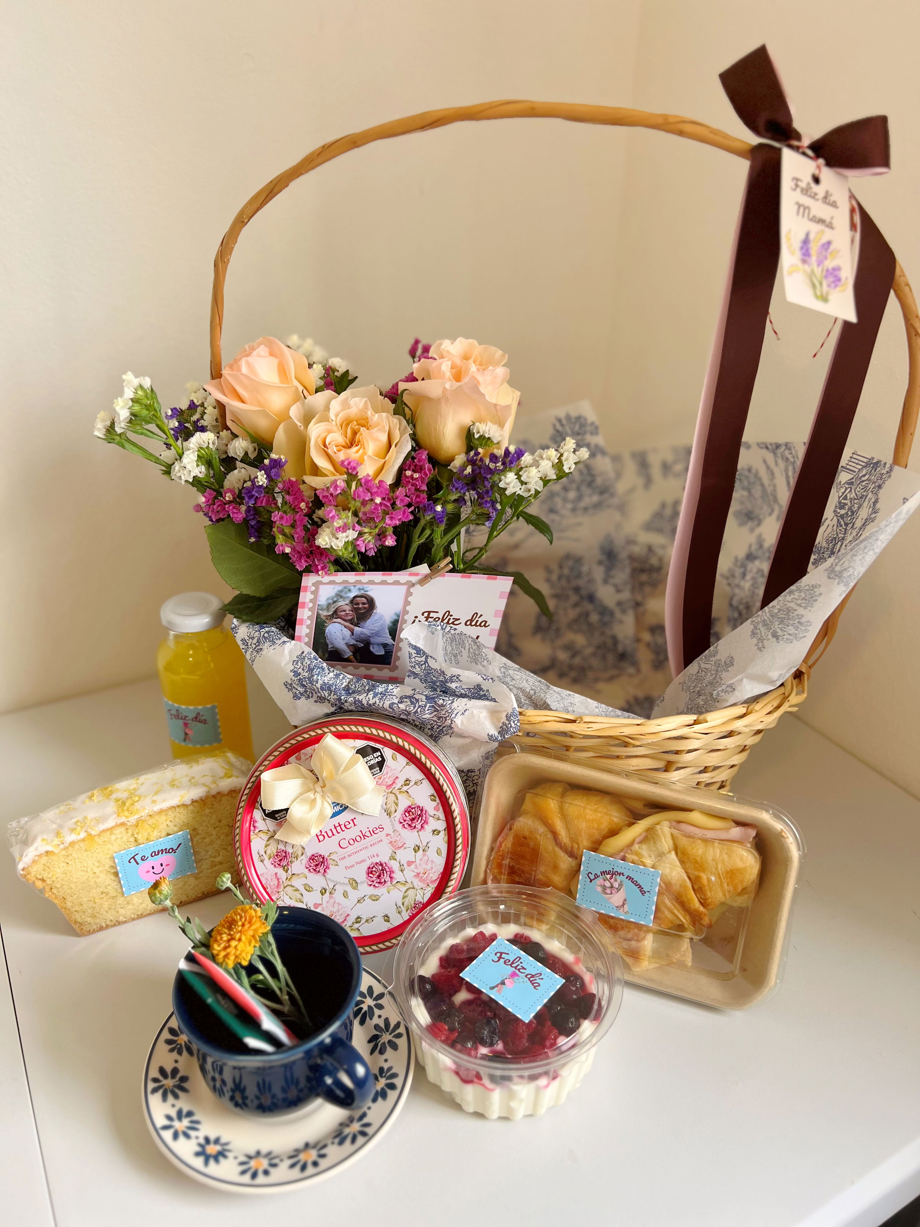 Un desayuno que celebra la calidez del hogar y la belleza de las flores. Presentado en una canasta rústica con flores frescas, combina sabores caseros y detalles delicados que transmiten amor en cada elemento. Perfecto para disfrutar en compañía🌸🥐☕
