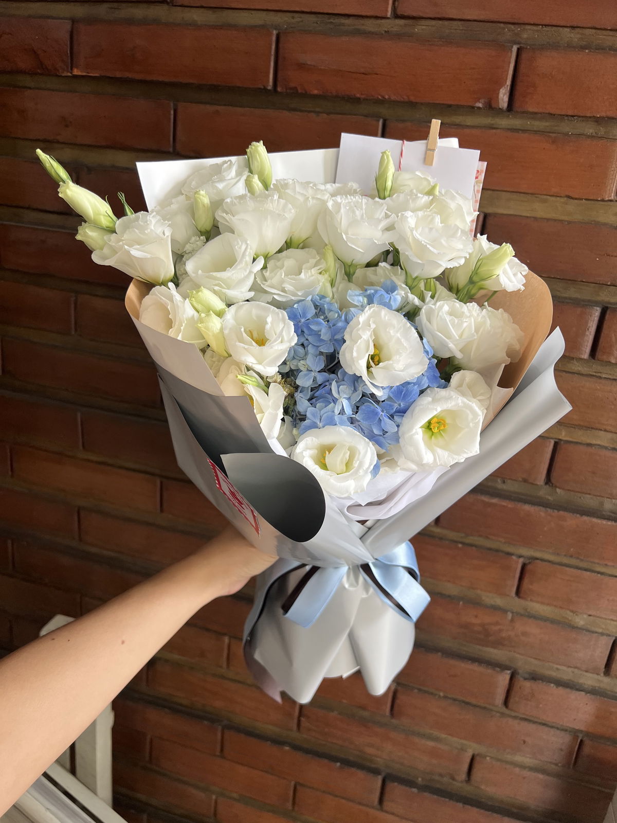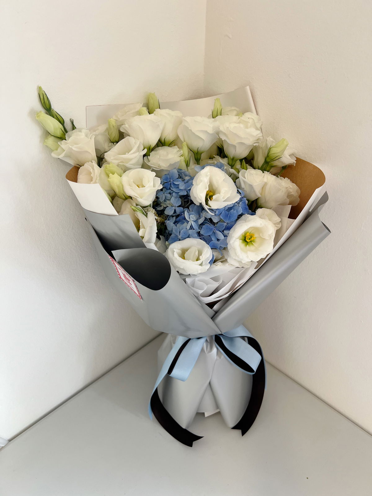 Este ramo está compuesto por una hortensia azul/celeste, lisianthus blanco y follaje.