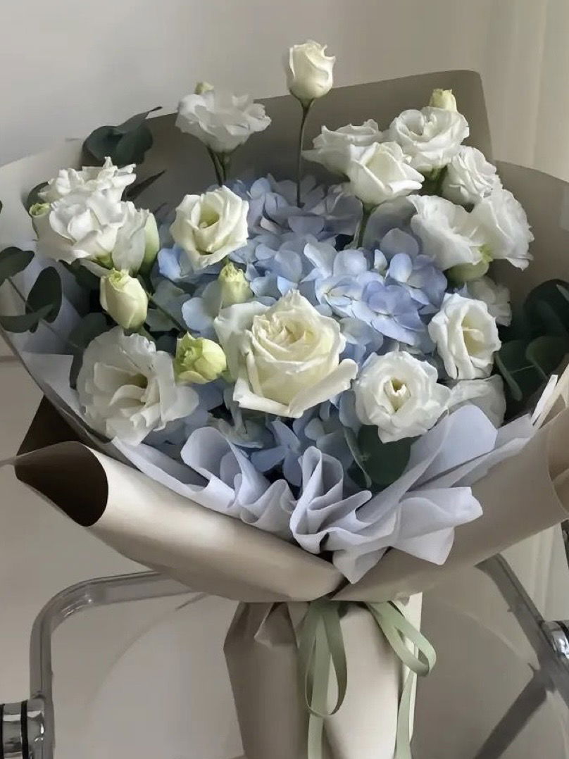 Este ramo está compuesto por una hortensia azul/celeste, lisianthus blanco y eucalipto.