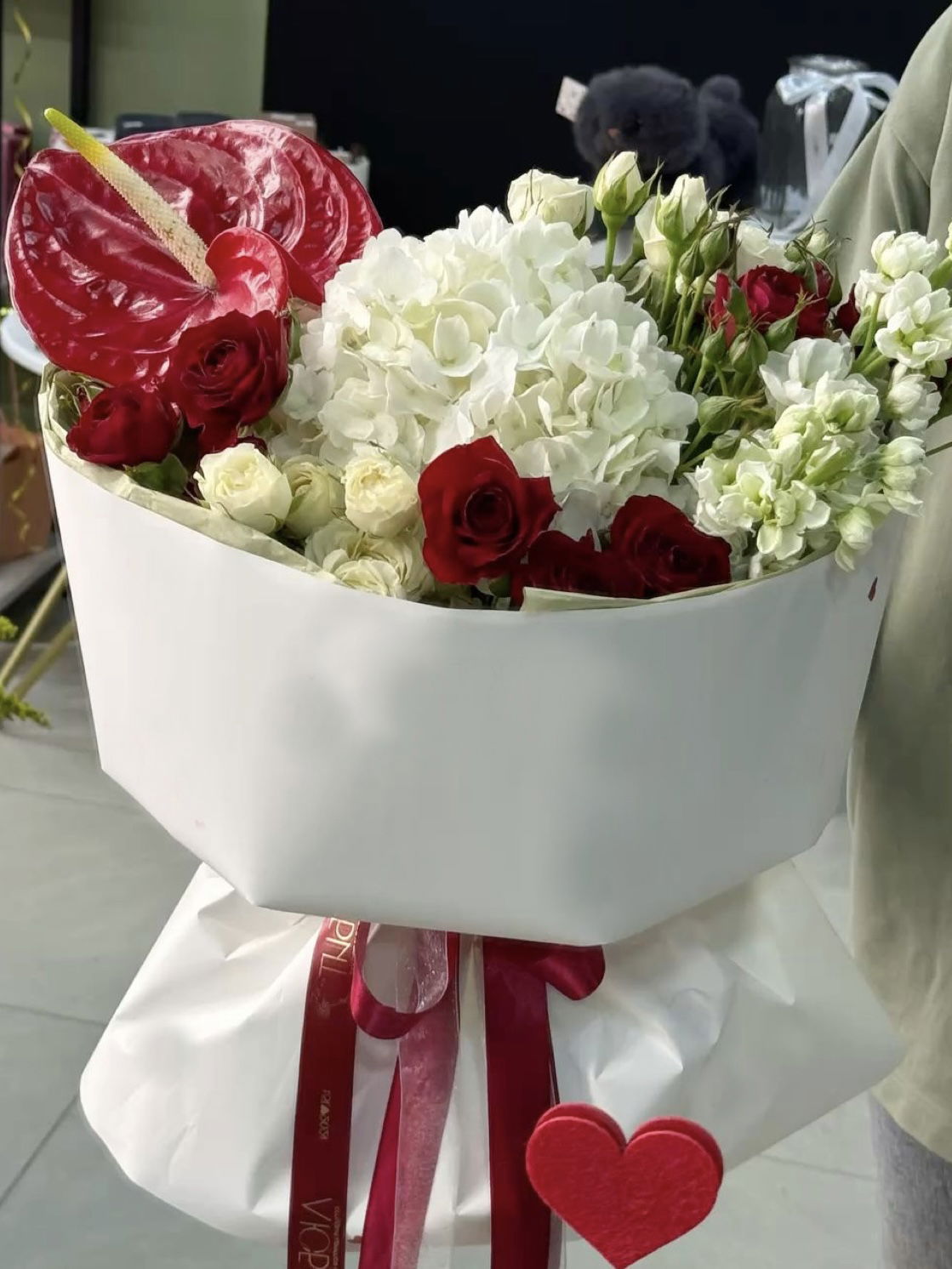 Este ramo está compuesto por hortensia blanca, rosas rojas, mini rosas blancas o lisianthus blancos y anturio.