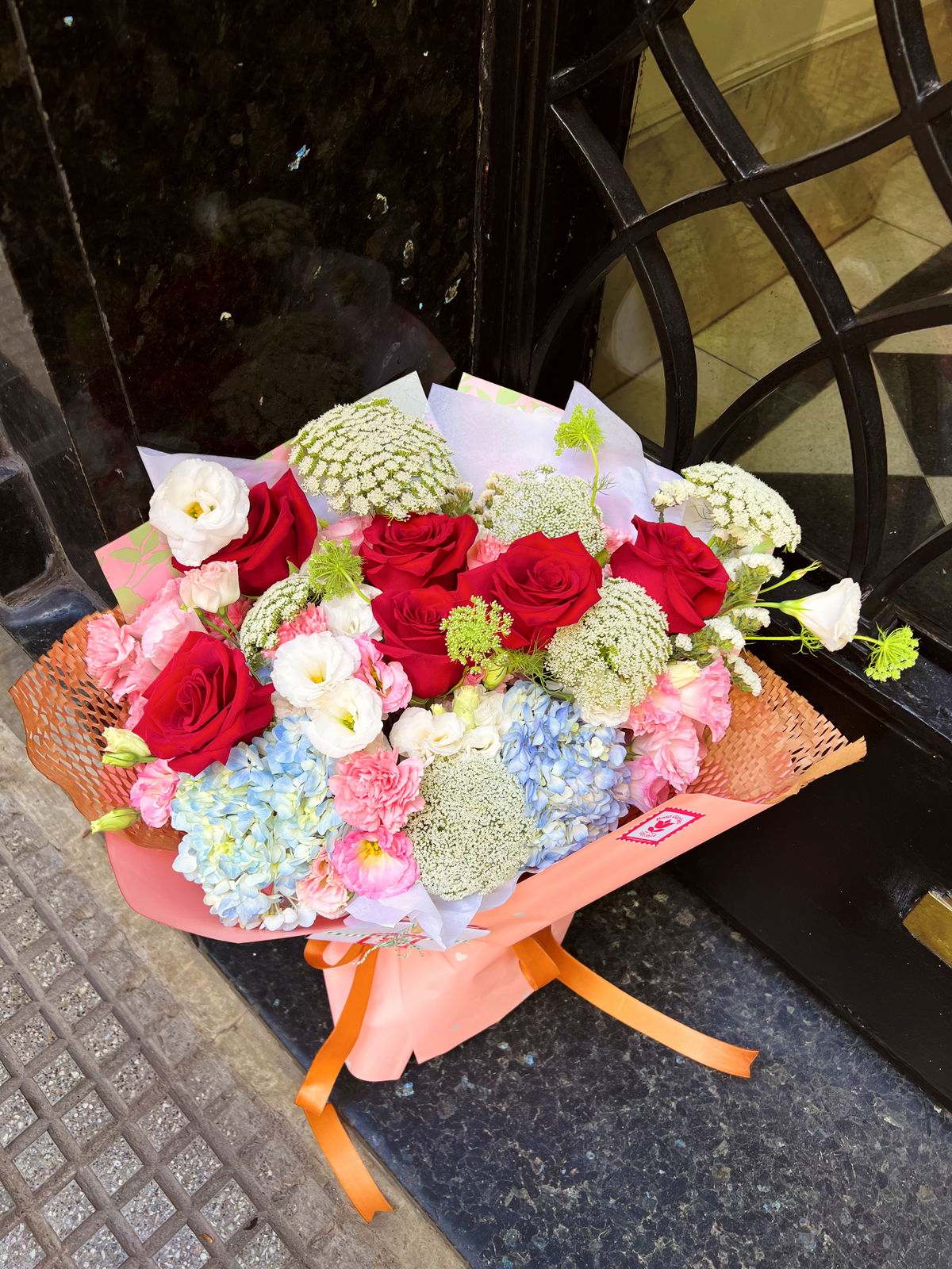 Rosas rojas importadas, hortensias, crisantemos importados, flores complementarias (astromelias/margaritas).