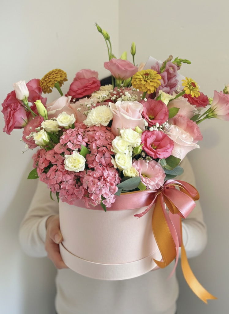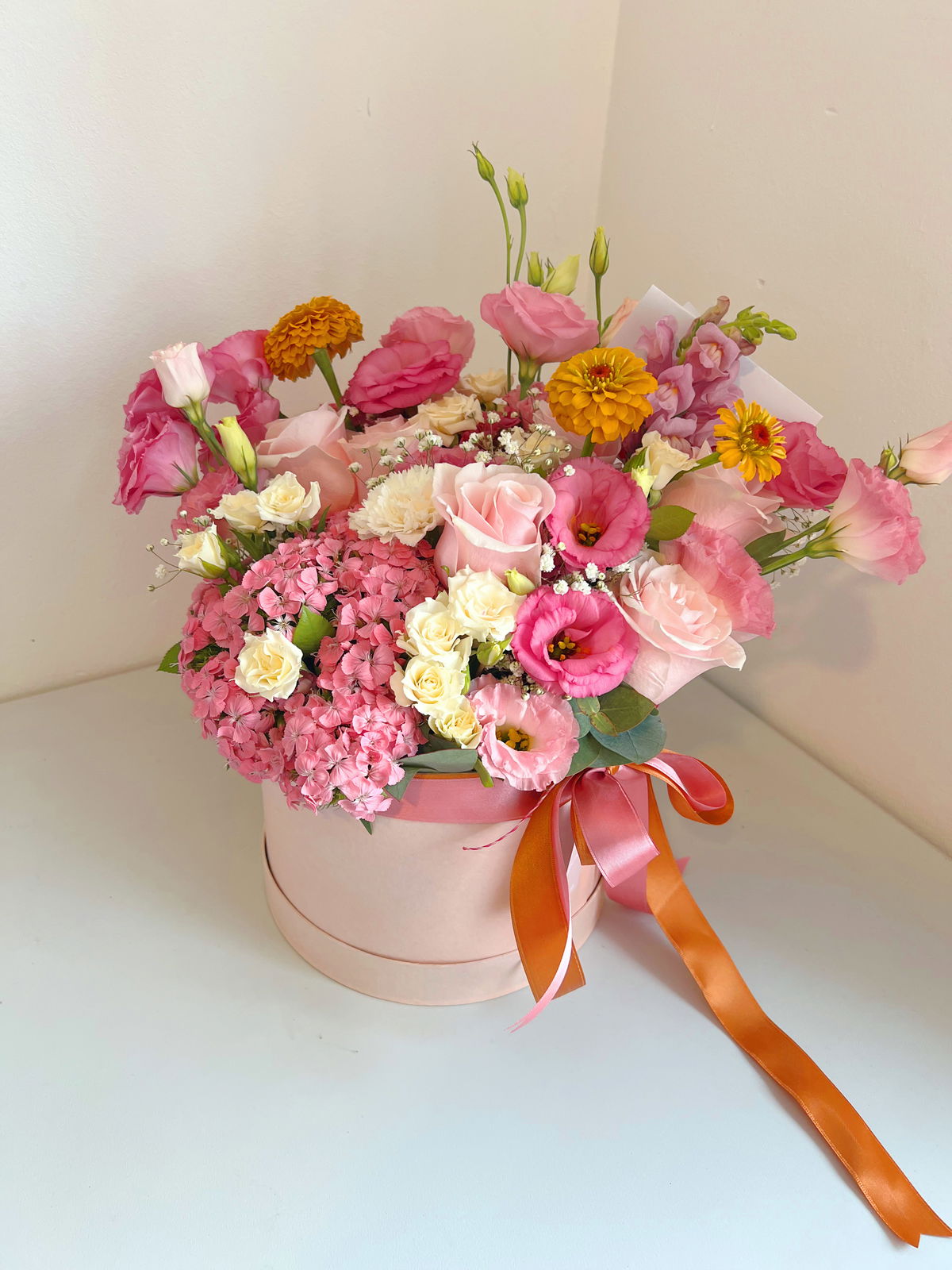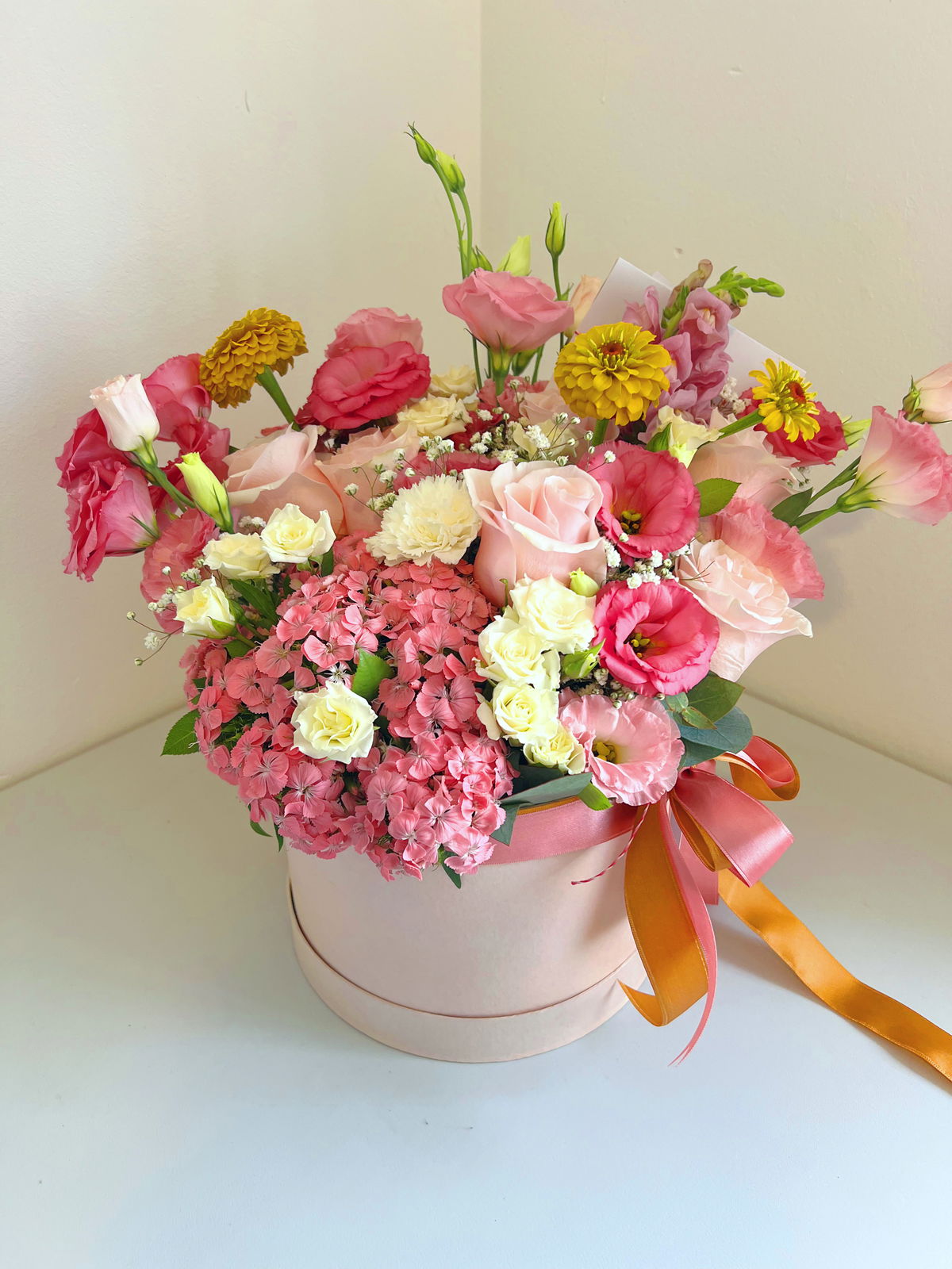 Este arreglo está compuesto por flores variadas de estación. El tipo de flor puede variar según el día y temporada. Se mantiene el estilo pero ningún ramo es igual a otro, cada uno es único.