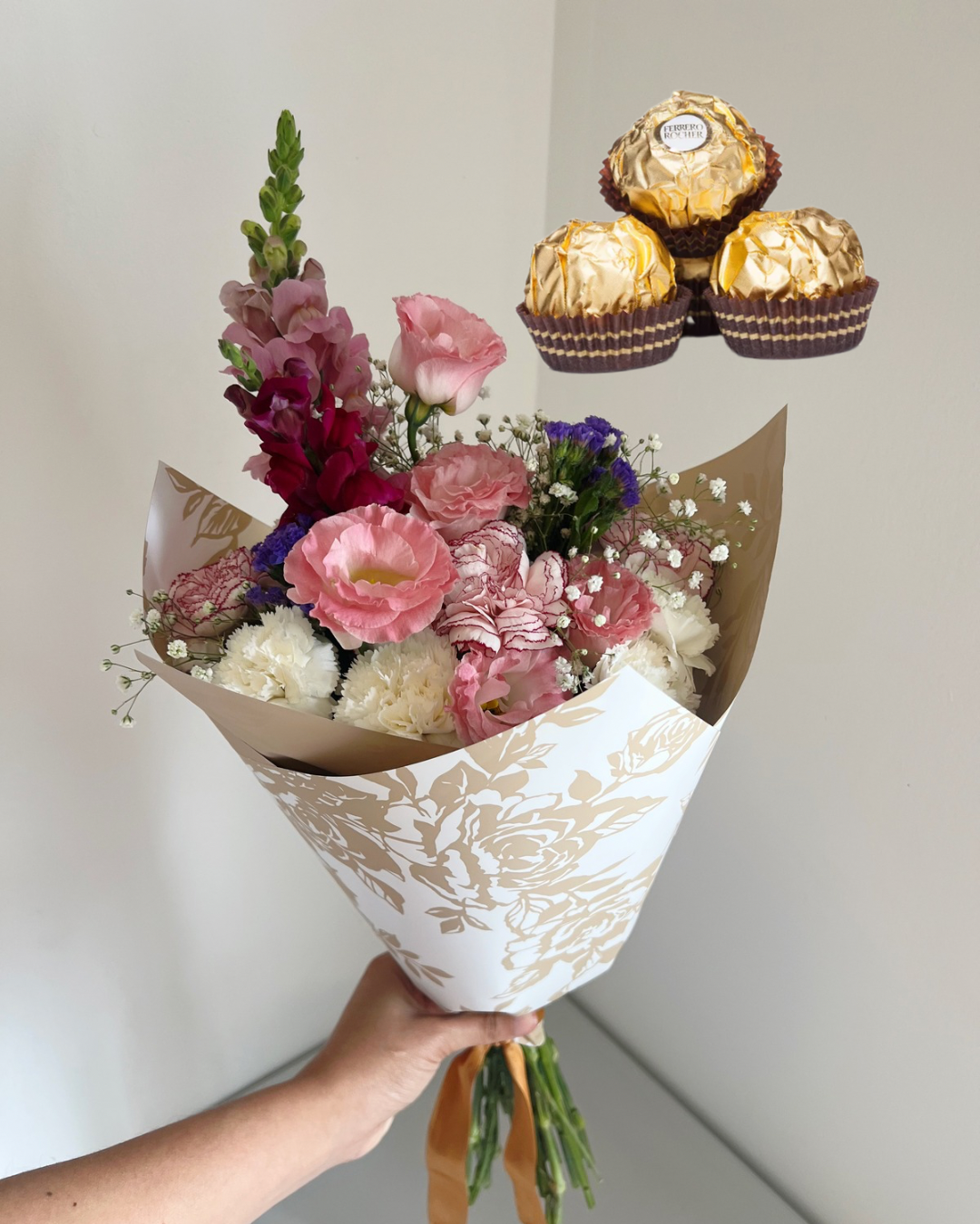 Este Ramo está compuesto por flores variadas de estación. El tipo de flor puede variar según el día y temporada. Se mantiene el estilo pero ningún ramo es igual a otro, cada uno es único.